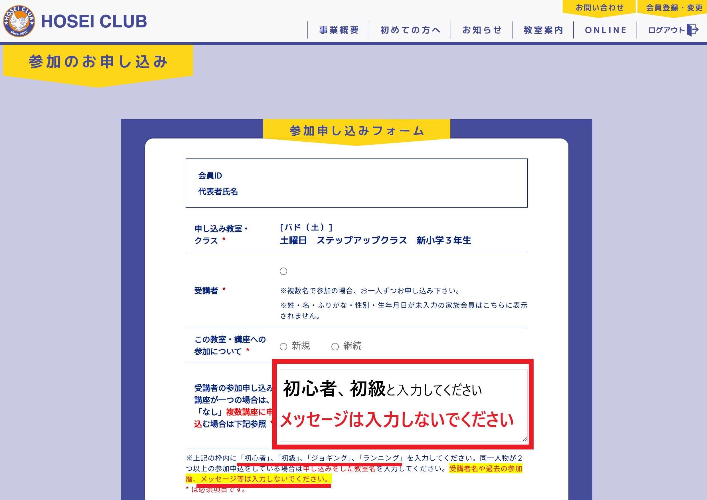 現在、参加申し込みフォーム空欄に「メッセージ」や「コメント」を入力される方がいらっしゃいます。しかし、こちらは、お申し込みフォーム内に記載の通り、この欄には、「なし」または、指定された内容のみをご入力ください。こちらに受講者名や過去の参加歴、メッセージ等は入力しないでください。お申し込みにあたっての注意事項に記載のとおり、キャンセルの連絡はここからでは受け付ける事はありません。教室に関するお問い合わせは、ホームページの「お問い合わせ」からのみとなります。